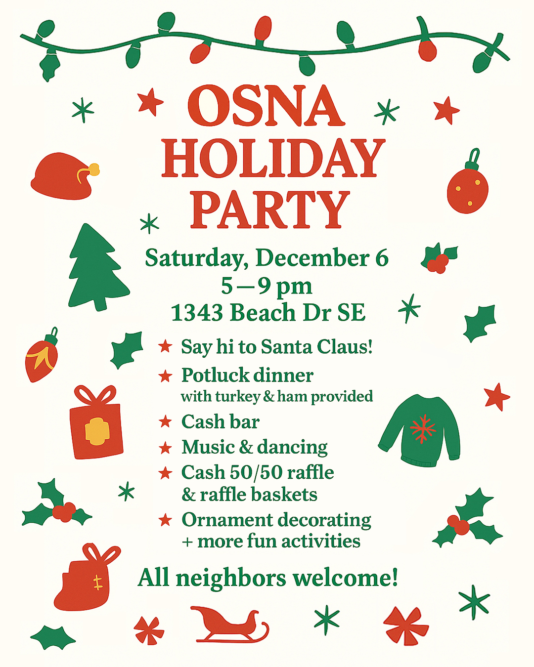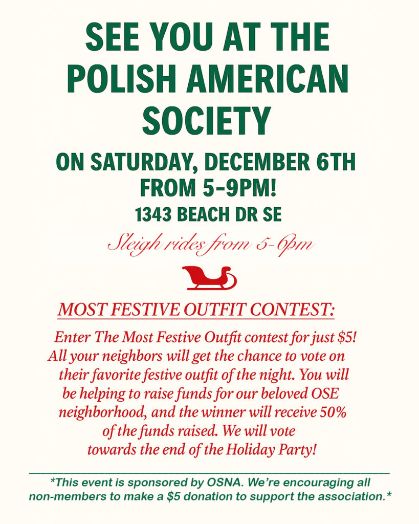 Join us for the OSNA Holiday Party on Saturday, December 6th, 2025 from 5–9 PM at the Polish American Club, 1343 Beach Drive SE. This beloved neighborhood tradition features our annual Holiday Food Festival, where neighbors bring their favorite side dish or dessert, and OSNA provides the turkey and ham.