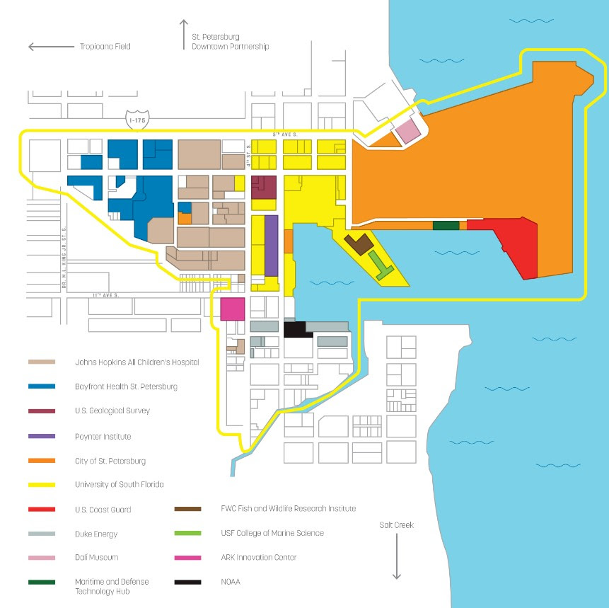 The St. Petersburg Innovation District (the District) is a public-private partnership (nonprofit) focused on increasing economic vibrancy and innovative problem solving in the Tampa Bay region.  The District was formed in 2016 by the major employers in the area – USF, Johns Hopkins All Children’s Hospital, Bayfront Hospital, as well as partners – City of St. Pete, St. Pete Downtown Partnership and the Foundation for a Healthy St. Pete.